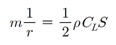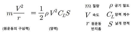 비행기의 방향변화를 일종의 '원운동'으로 간주해서 보면 급격한 방향변화가 일어날수록 원운동의 반지름은 작아지게 됩니다. 이 때 양력과 원운동의 반지름의 관계를 살펴보면 다음과 같은 관계식으로 나타낼 수 있습니다.