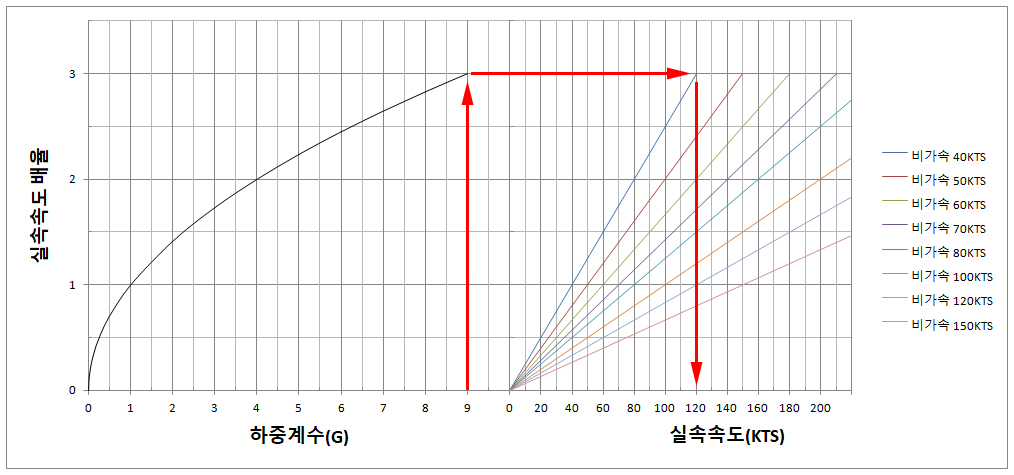 그래서 하중계수가 1G인, 직진수평비행 때의 실속속도를 기준으로, 하중계수가 4G일 때, 실속속도는 2배 증가하며, 하중계수가 9G일때 실속속도는 3배 증가하게 됩니다. 만약 비가속 실속속도가 40 knots인 비행기가 9G를 받게되면, 실속속도는 120 knots로 증가하게 되는 것입니다.