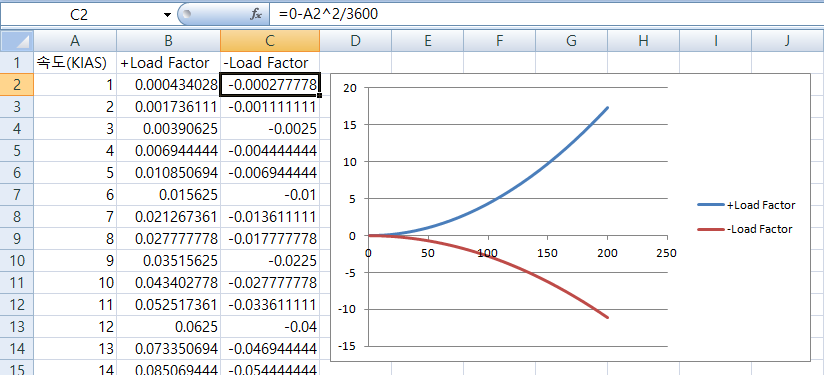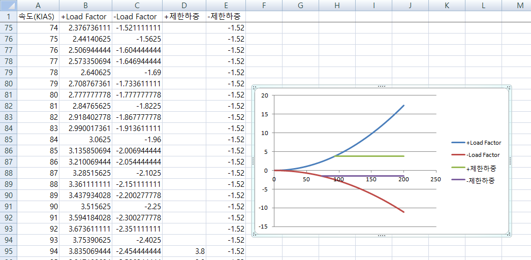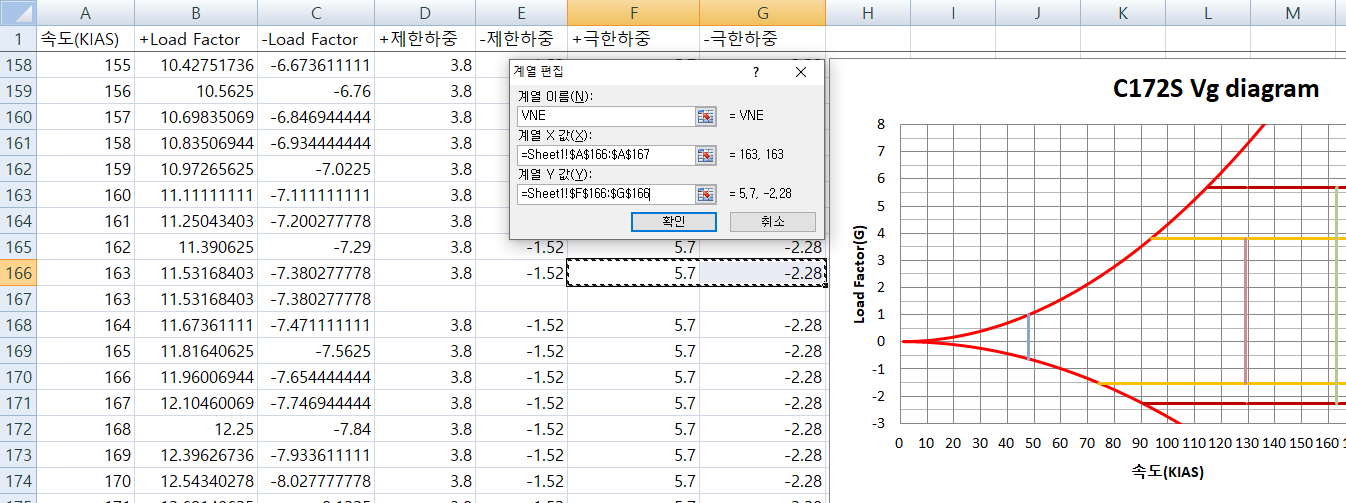 마지막으로 속도 한계 값들을 차트상에 나타내야하는데, x축이 되는 속도값들 중 해당 속도 값을 찾아 똑같은 속도 값을 하나 더 추가(행 추가)하여 y축으로 선이 만들어 질 수 있도록 한다. 여기서 y값은 '실속(stall)속도'는 Load Factor 값, 'VNO속도'는 제한하중 값, 'VNE속도'는 극한하중 값으로 설정한다.