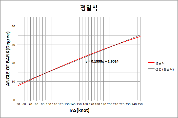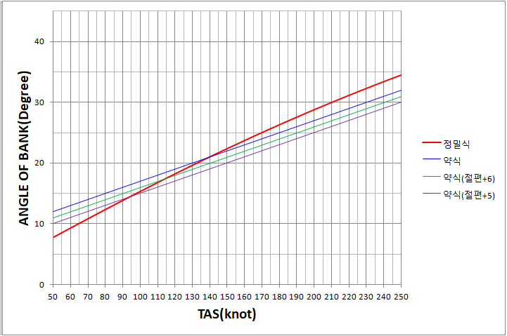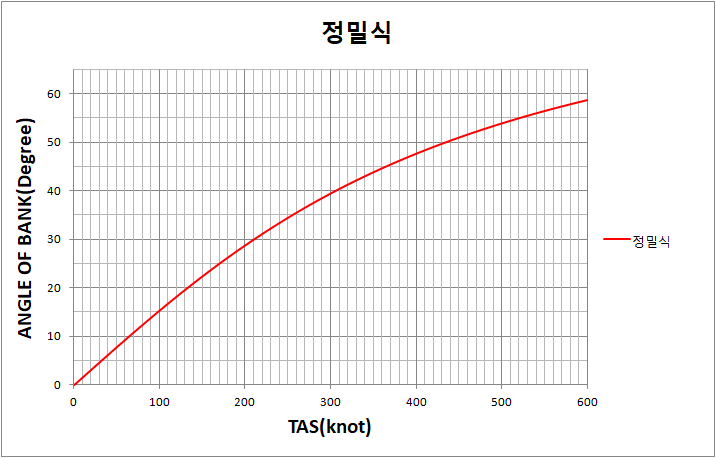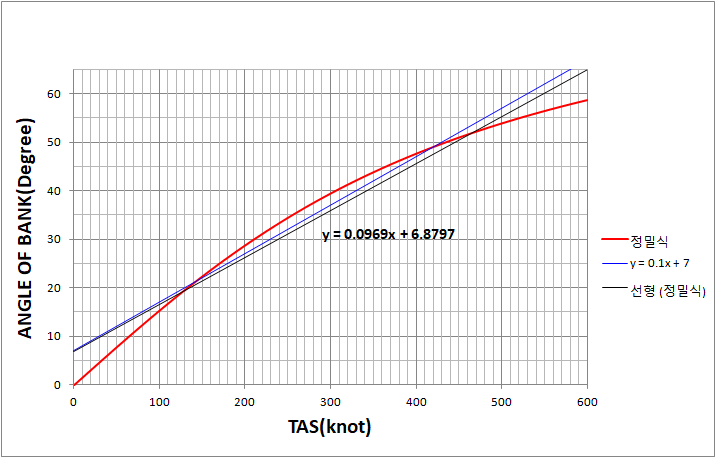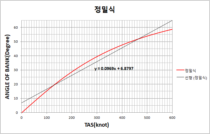이상적인 SRT 뱅크 구하는 정밀 계산식을 완성했으면, 속도별로 BANK 값을 구하여 그래프를 그리고 그 경향과 추세를 파악해볼 것입니다. 그리고 약식인 (TAS/10) + 7의 그래프와도 비교를 해봄으로써 약식이 어떻게 만들어졌는지 조심스럽게 한번 파악해 보겠습니다.