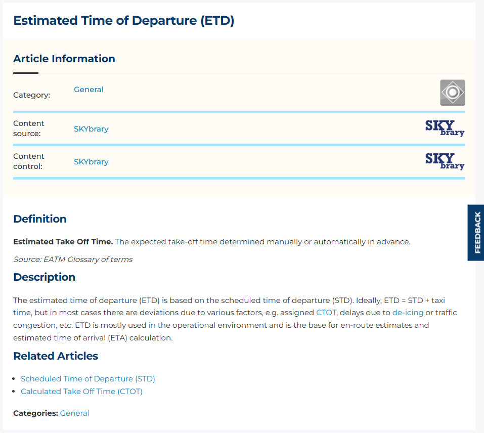 ETD의 정의에 대해 에 대해 ICAO, FAA, EASA를 막라하는 수많은 공식 레퍼런스를 찾아보았지만, 그 어디에서도 ETD에 대한 정의를 찾아볼 수 없었다(반대로 ETA는 존재하였다.).