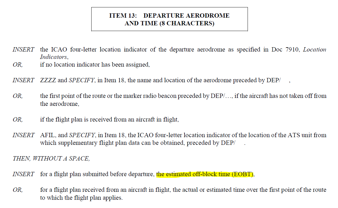결론적으로, 비행계획서에서 말하는 출발 예정 시간의 기준은 스탠드(또는 스팟)이다. 그리고 그 내용은 ICAO PANS-ATM(Doc 4444), APPENDIX 2. Flight plan에 명시 되어 있다.