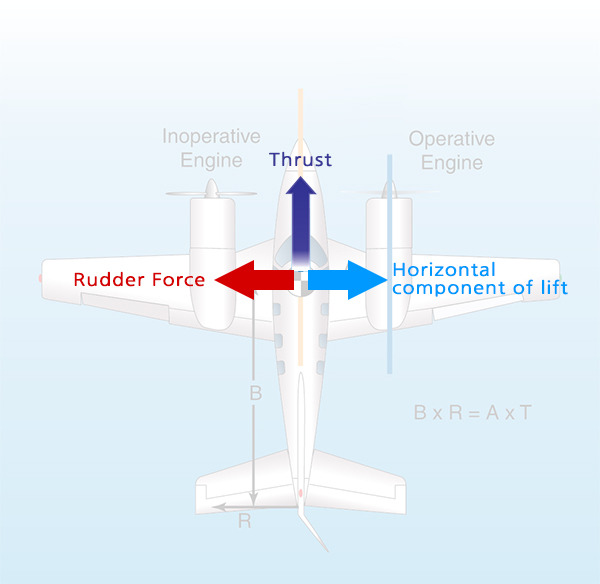 다발 비행기에서 한쪽 엔진만 멈추게 되면 추력선(Thrust line)이 비행기 무게중심을 벗어나게 되어 Yawing 모멘트가 발생하게 되고, 이를 막기 위해서는 살아있는 엔진 쪽으로 Rudder를 사용하게 됩니다.